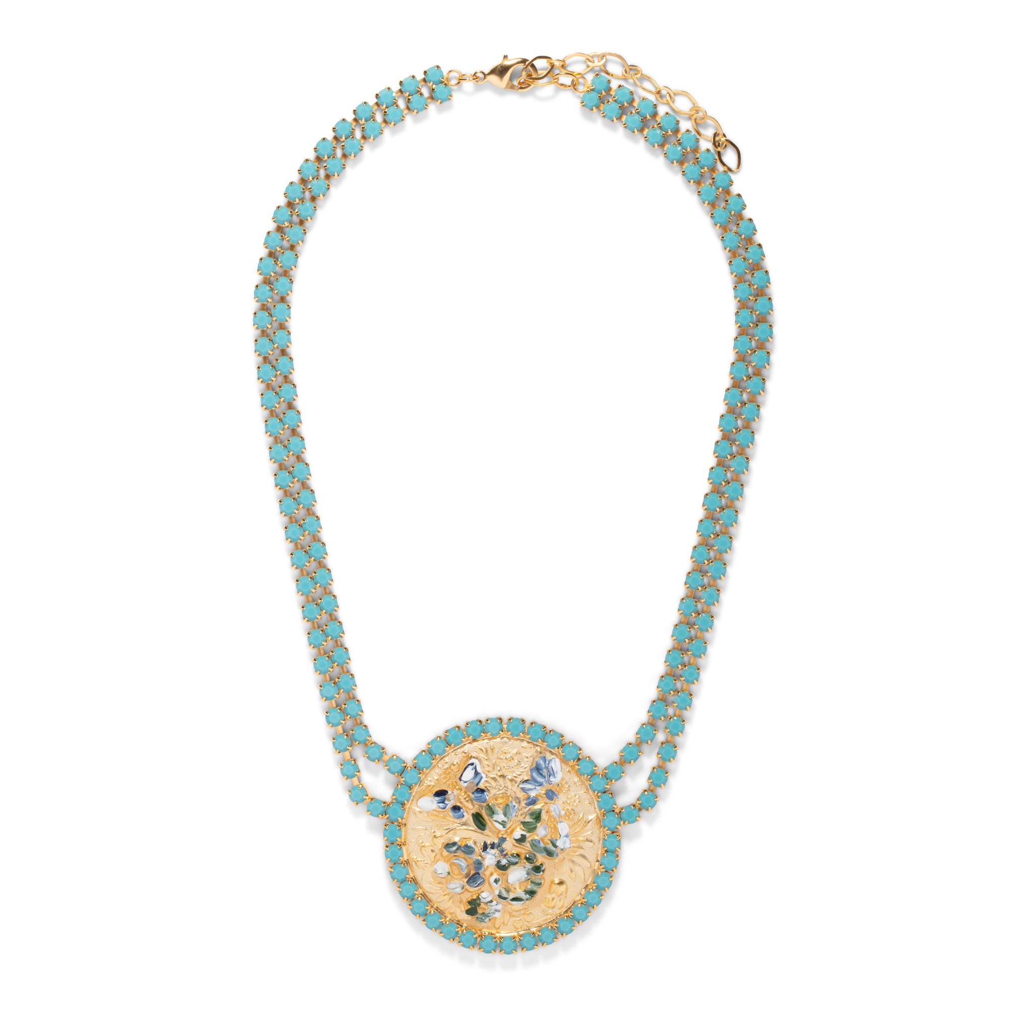 A gorgeous hand crafted and hand-painted piece. The double turquoise crystal chain is 17" long with optional extender. 18k gold finish, made in the USA