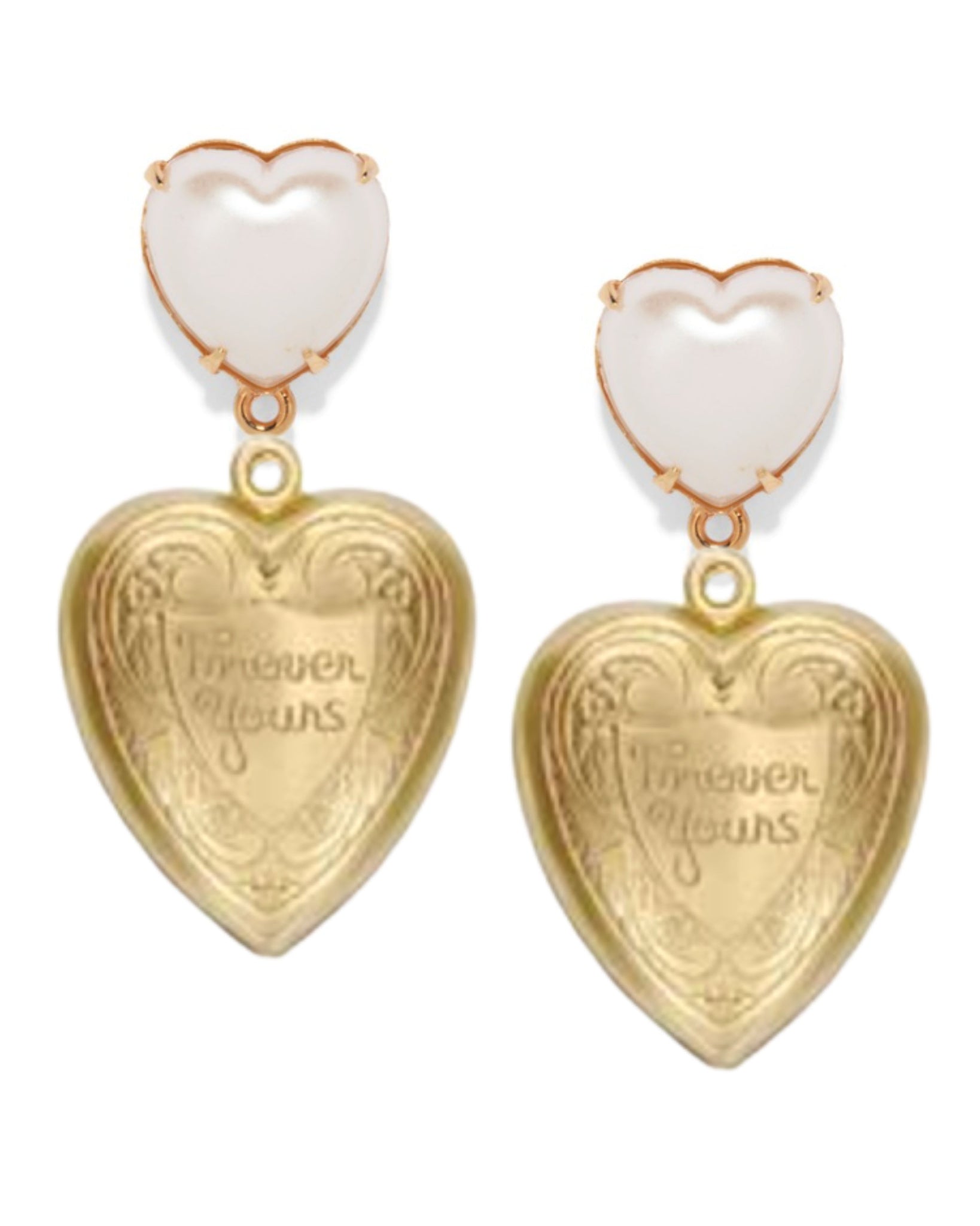A love letter to a time past, we have fallen for our pearl heart earrings. They start with a handmade puff heart that tops a vintage design locket that says forever yours. Despite the statement, the earrings are light as air. 2”long with an 18k gold finish. Made in the USA. Surgical steel posts.